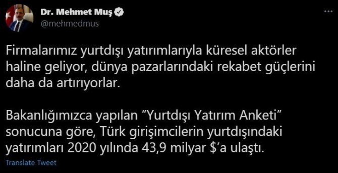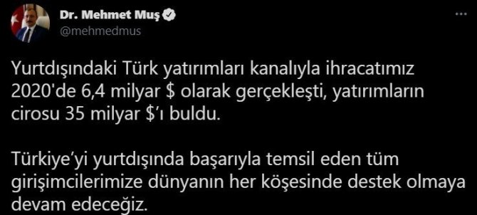 "Firmalarımız yurt dışı yatırımlarıyla küresel aktörler haline geliyor, dünya pazarlarındaki rekabet güçlerini daha da artırıyorlar. Bakanlığımızca yapılan "Yurtdışı Yatırım Anketi" sonucuna göre Türk girişimcilerin yurt dışındaki yatırımları 2020 yılında 43,9 milyar dolara ulaştı. Yurt dışındaki Türk yatırımları kanalıyla ihracatımız 2020'de 6,4 milyar dolar olarak gerçekleşti, yatırımların cirosu 35 milyar doları buldu. Türkiye'yi yurt dışında başarıyla temsil eden tüm girişimcilerimize dünyanın her köşesinde destek olmaya devam edeceğiz."