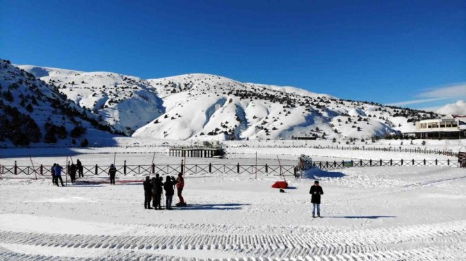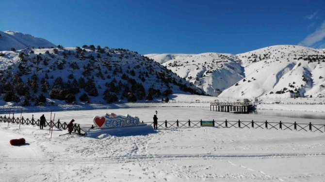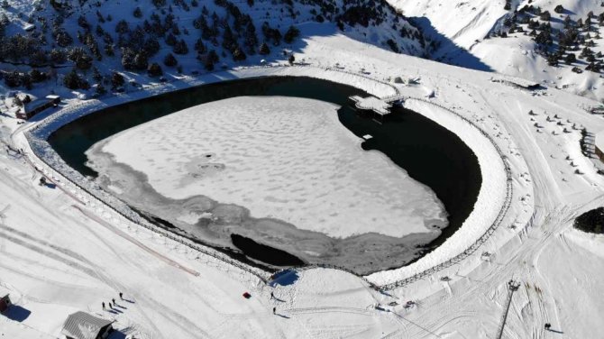 Erzincan'ın güneyindeki Munzur dağlarının eteğinde 2 bin 970 rakımda bulunan ve yüzeyi soğuk havanın etkisiyle buz tutan gölde güzel kış manzaraları oluştu. Gölün bulunduğu Ergan Dağı Kış Sporları Merkezinde, yeni sezon için çalışmalar tamamlandı. Kar kalınlığının 50 santimetreyi bulduğu kayak merkezi pistlerini Cumartesi günü kayak severlerin hizmetine açacak.