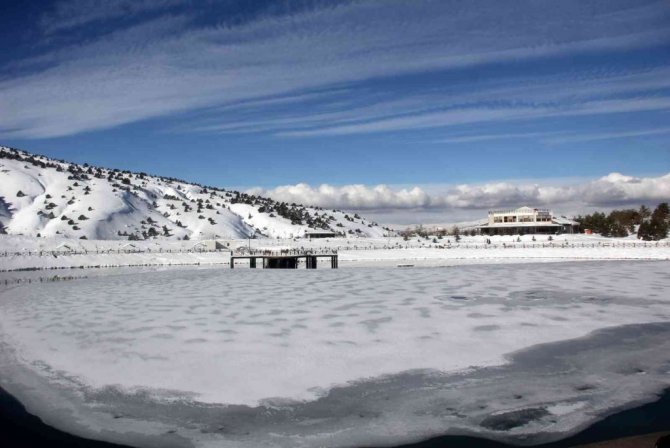 Yüzeyi buz tutan Ardıçlı Gölü mest ediyor