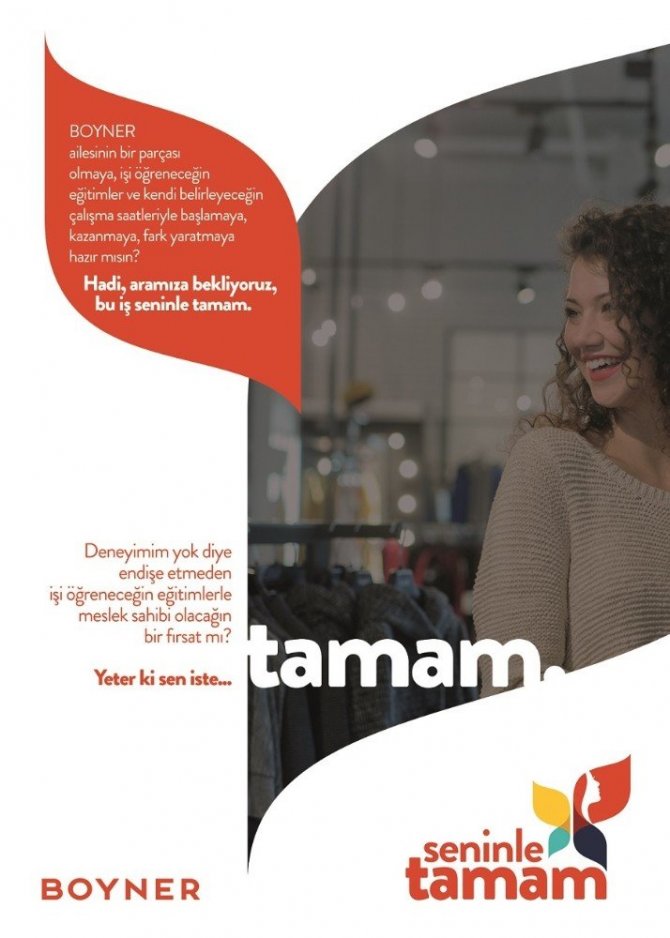 Bu kapsamda ‘Seninle Tamam’ projesiyle, şimdiye kadar çalışmamış, çocuk sahibi olduktan sonra çalışma hayatına ara vermiş ve sonrasında da iş hayatına dönememiş kadınlar Boyner ailesinin bir parçası olmaya davet ediliyor. Yapılan bilgilendirmeye göre proje, kadınlara kendi belirleyecekleri çalışma saati opsiyonlarıyla işe başlama özgürlüğü sunuyor. Bu sayede, çocuklarını okula götürmek ya da onları karşılamak zorunda olan kadınların, iş hayatına atılmalarında ya da geri dönmelerinde karşılaştıkları en büyük dezavantajlardan biri ortadan kalkıyor.