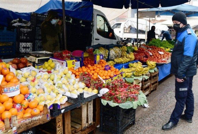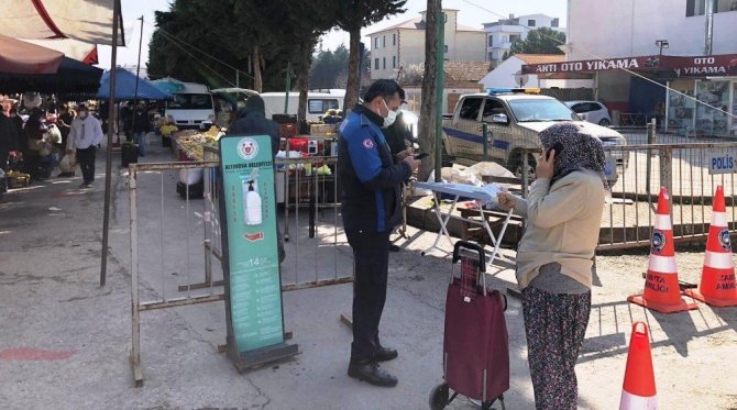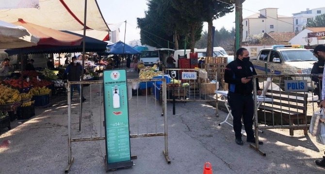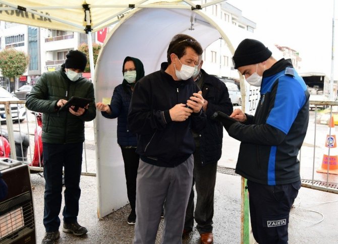 Altınova Semt Pazarında; vatandaşlar, HES Kodu sorgulaması ve ateş ölçümü yapıldıktan sonra pazar alanına alınırken maske kontrolü, ateş ölçümü ve dezenfekte işlemi uygulanıyor.