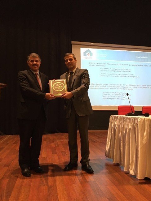 Konferansın sonunda Kaymakam Erdoğan Turan Ermiş ve Belediye Başkanı Lütfi Vidinel günün anısına Prof. Dr. Musa Yıldız plaket takdim ederken Prof. Dr. Musa Yıldız’da Ahmet Yesevi Üniversitesi Yayınlarından ‘Divan-ı Hikmet’ kitabını hediye etti.