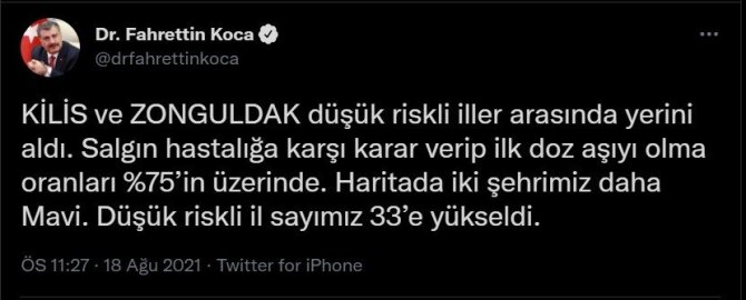 Sağlık Bakanı Fahrettin Koca sosyal medya hesabından yaptığı paylaşımda aşı haritasını paylaştı. Zonguldak 75,1 oranı ile sarıdan maviye dönen iller arasında yer aldı. Bakan Koca "Kilis ve Zonguldak düşük riskli iller arasında yerini aldı. Salgın hastalığa karşı karar verip ilk doz aşıyı olma oranları %75'in üzerinde. Haritada iki şehrimiz daha Mavi. Düşük riskli il sayımız 33'e yükseldi." ifadelerine yer verdi. Zonguldak Valisi Mustafa Tutulmaz ise Zonguldak halkını tebrik etti. Sosyal medya hesabından paylaştığı tebrikte, "Duyarlı Zonguldaklı kardeşlerimizin sayesinde aşılanan kişi sayısında mavi kategoriye geçtik. Tebrikler Zonguldak" dedi.