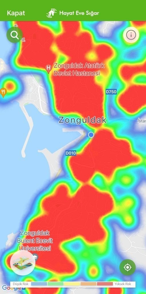 Öte yandan, Hayat Eve Sığar Uygulaması'nda (HES) yer alan haritada kızaran Zonguldak kent merkezi yüksek riskli olarak yer alıyor.