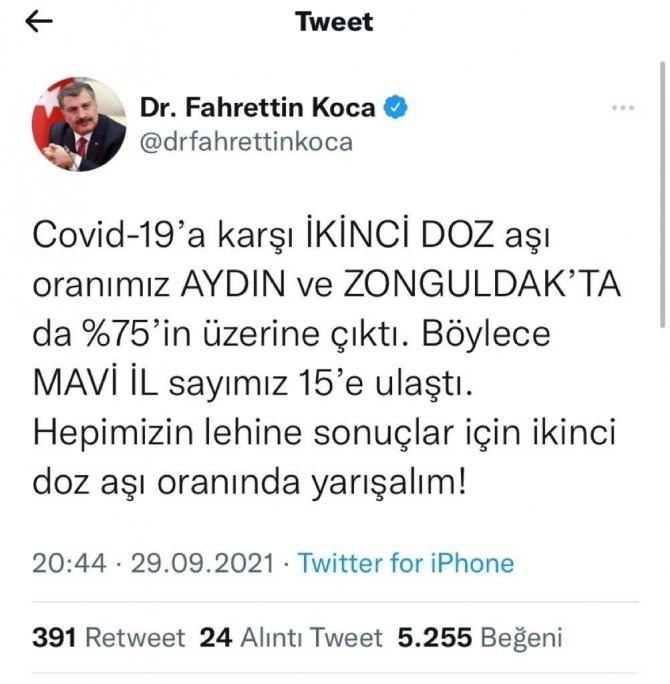 Sağlık Bakanı Fahrettin Koca, Covid-19'a karşı ikinci doz aşı oranının Aydın ve Zonguldak'ta yüzde 75'e ulaştığını açıkladı. Böylece mavi il sayısı ise 15'e yükseldi. Koca, "Hepimizin lehine sonuçlar için ikinci doz aşı oranında yarışalım" hatırlatmasında bulunarak aşının önemine dikkat çekti.