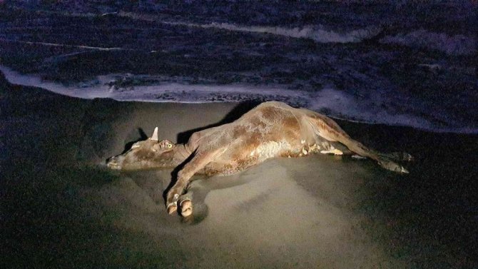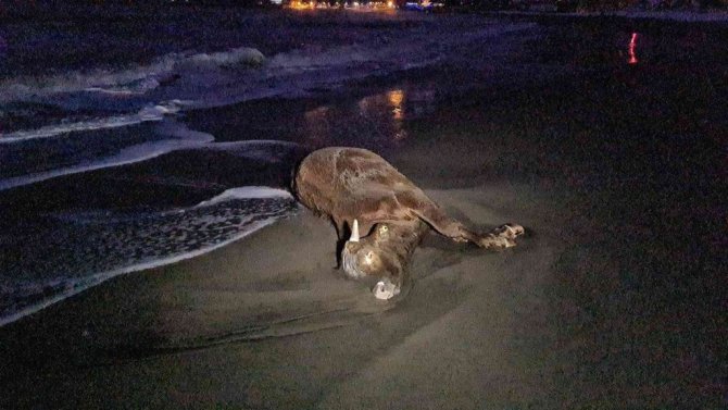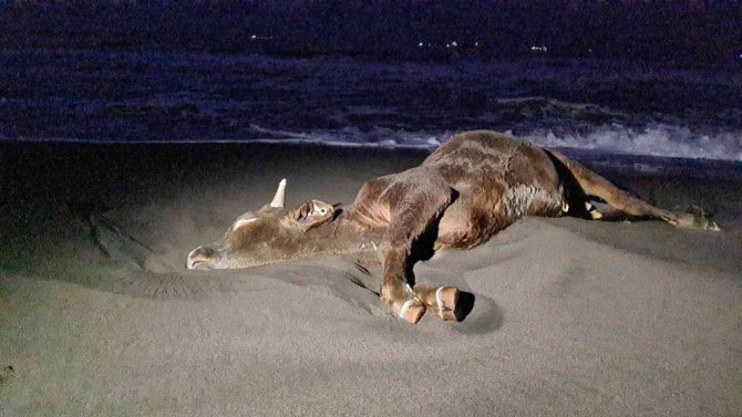 Zonguldak'ın Ereğli ilçesi Belediye Plajlar mevkiinde deniz kıyısına telef olan bir inek cesedi vurdu. Yurt dışından ithal edildiği belirlenen hayvanın gemide telef olup atılmış ya da fırtınada geminin sallanmasıyla düşmüş olabileceği belirtildi.