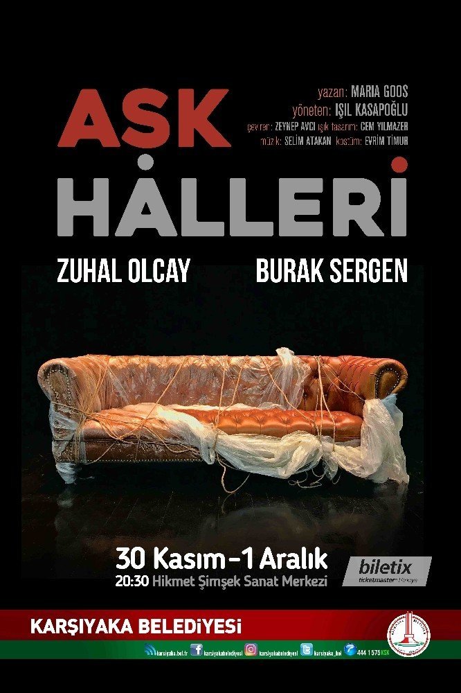 Işıl Kasapoğlu’nun yönetmenliğini üstlendiği Aşk Halleri, 1 Aralık Cuma akşamı aynı sahnede ve saatte, İzmirli tiyatroseverlerle bir kez daha buluşacak. Oyunun biletleri, Karşıyaka Belediyesi Hikmet Şimşek Sanat Merkezi’nin gişesinden ve Biletix’ten edinilebilecek.